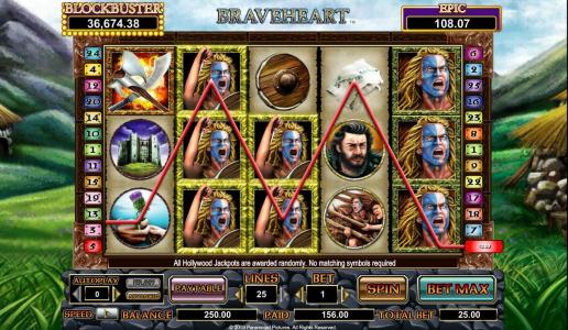 Braveheart is the wild card in the game and it can substitute the scatter, bonus and jackpot symbol. When it does it also acts as a doubling multiplier. The scatter symbol is presented by a battling sword and an ax. When you trigger a winning combination of three or more scatters you will get some free spins that can actually be retriggered if you hit three scatters during this period. There is a bonus round called Hollywood Jackpots in which you need to choose four fields from a grid that will award you with different amount of points. Depending on the amount of points that you have collected a jackpot will be awarded to you. It can be in the range from tens of dollars to thousands of dollars.