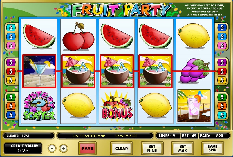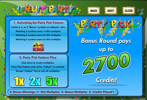 When you are playing Fruit Party Slots, the game allows you to bet up to one hundred coins on a single spin. Fruit Party Slots has a wide variety of coin denominations available, including $0.01, $0.02, $0.05, $0.1, $0.2, $0.5, $1, $2, $5 and $10.00. The second largest jackpot in Fruit Party Slots is one thousand coins, while the biggest jackpot is worth 2500 coins.