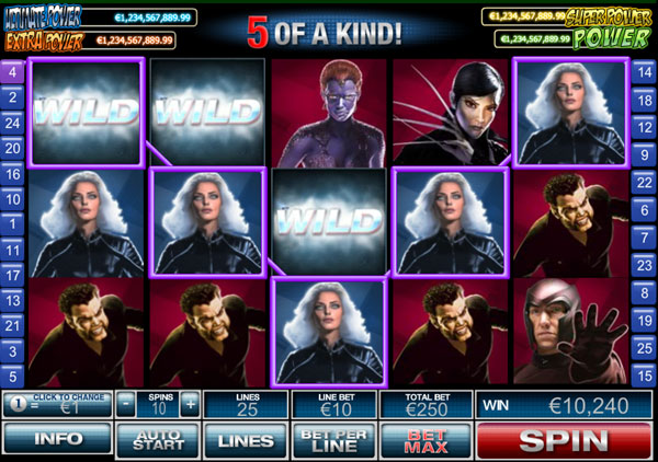 Even though it is based on the popular Marvel comic book, the slot is themed more around the trilogy of the X-Men films. The characters on the reels include Magneto, Storm, Professor Xavier, Wolverine, Cyclops, Mystique, Sabretooth, Juggernaut, Lady Deathstrike, Nightcrawler and X-Men logos. Some of them animate when a winning combination is completed. A rock and roll and techno- combined sound track makes the game even more thrilling and exciting.